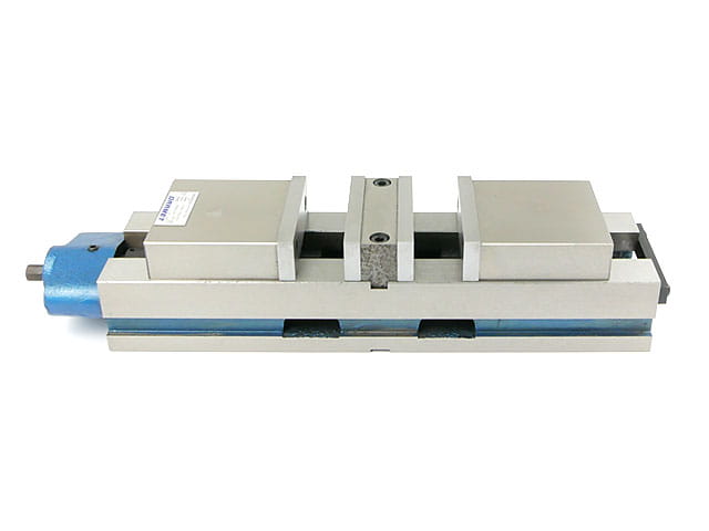 - The vise has grooves and channels to firmly secure it on the machining table using clamping elements.