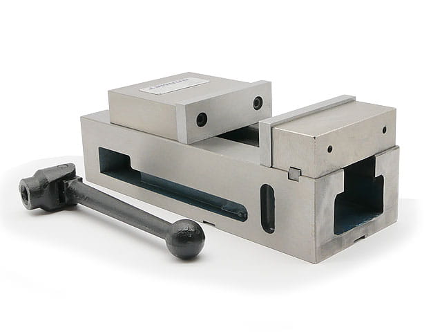 - The vice has grooves and channels to securely mount it on the machining table using mounting elements.
