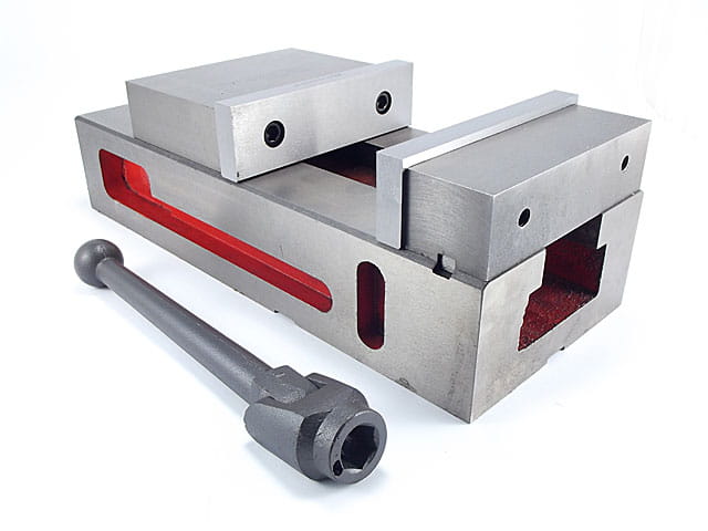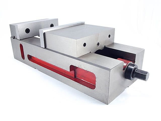 - The vise has grooves and channels to securely fasten it to the machining table using fastening elements.