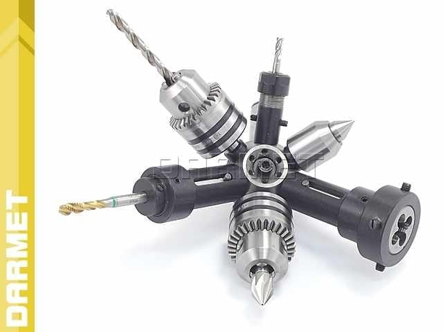 - The head has 6 indexed sockets in which you can mount e.g. drill chucks, tap and die holders, die holders, lathe centers, etc.